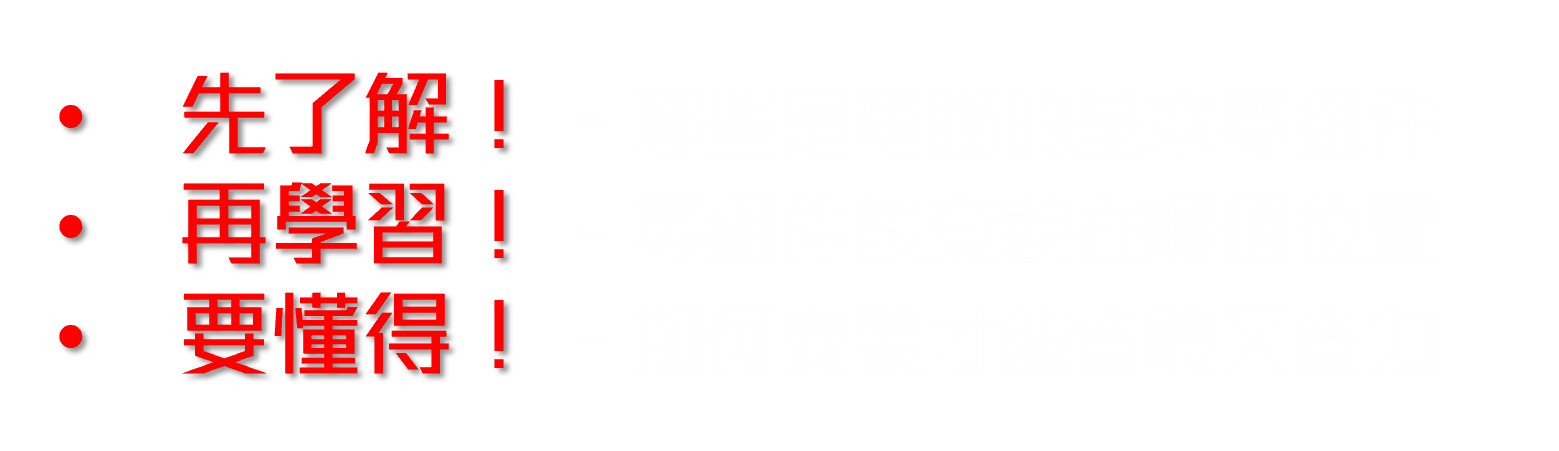| 首先,必須了解包含機殼、CPU、主機板、顯示卡、電源供應器、水冷、風扇、記憶體、SSD...等組裝電腦必要零組件的相關資訊及功能;接著則要進一步學習零組件彼此之間的相對安裝位置及正確安裝方式,最後則是要懂得省時省力安裝的各式小撇步;三者齊備,就可以著手打造個人專屬主機囉! |